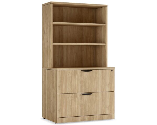 The 2-Drawer Lateral File with Hutch offers a combination of open and closed storage. Ideal for private office and home office applications, this storage unit allows you to store files and paperwork, and display books, decor, above to personalize your space.
