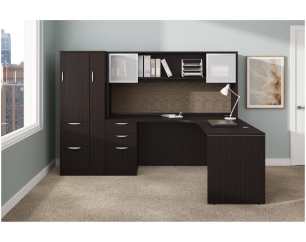 - Classic Desk Hutch 71″W with 2 Laminate Doors – Manage clutter with the 2 doors that help you hide paperwork and stationery, while open shelves give you room to personalize your space.